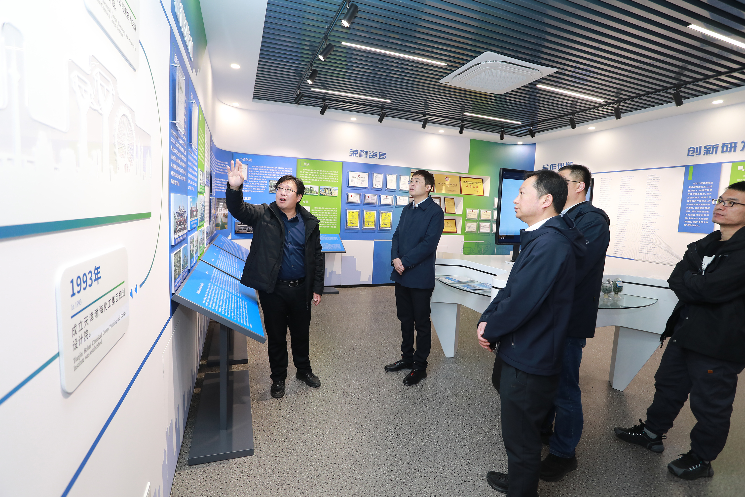 考察團(tuán)一行首先參觀了渤化工程侯德榜雕像和多媒體展廳,隨后在公司會(huì)議室進(jìn)行溝通交流。蔣澤宇介紹了江河園區(qū)的相關(guān)情況,并與渤化工程就該化工園區(qū)中七臺(tái)河科技小鎮(zhèn)項(xiàng)目產(chǎn)業(yè)發(fā)展方向、建筑風(fēng)格,公用配套設(shè)施等具體問題進(jìn)行了交流討論,雙方針對(duì)園區(qū)的特點(diǎn)及后續(xù)招商、發(fā)展規(guī)劃等方面進(jìn)行了深入的探討分析。