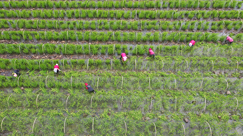 2023年2月23日,浙江省溫嶺市新河鎮(zhèn)農(nóng)民進(jìn)行茭白秧苗春季管理(無(wú)人機(jī)照片)。新華社發(fā)(周學(xué)軍 攝)